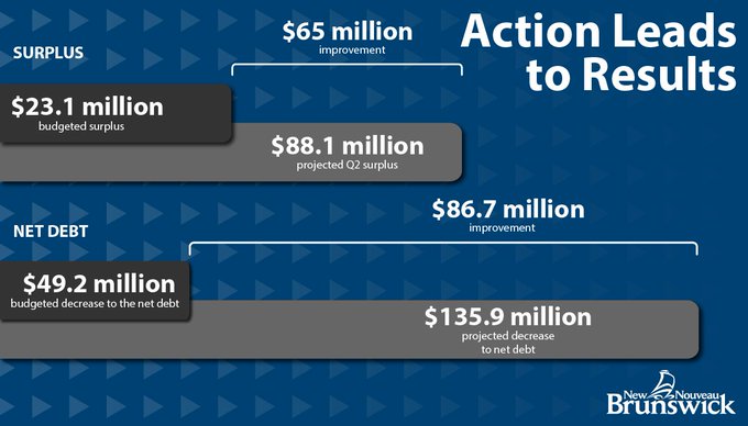 Government of NB @Gov_NB · Nov 15 Second-quarter results for the 2019-20 fiscal year show a projected surplus of $88.1 million compared to the budgeted surplus of $23.1 million. bit.ly/2qgE8HU 5 7 21